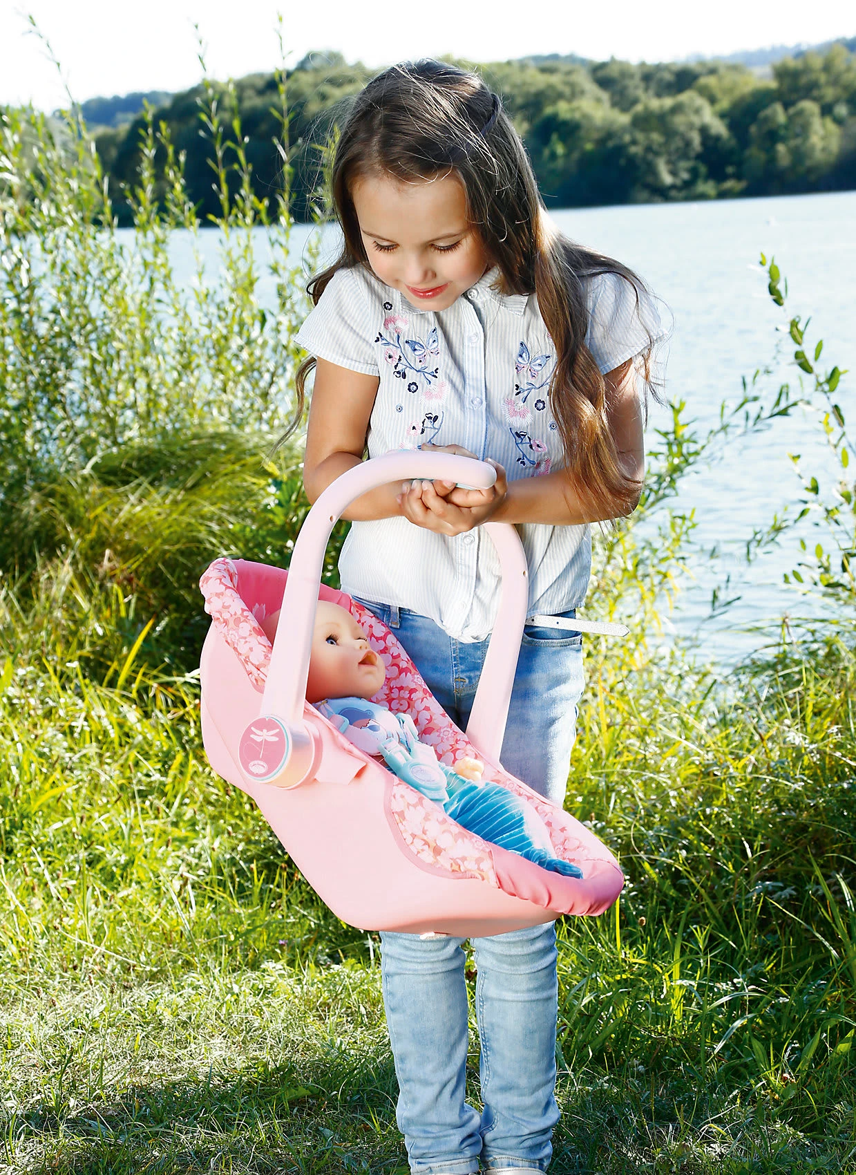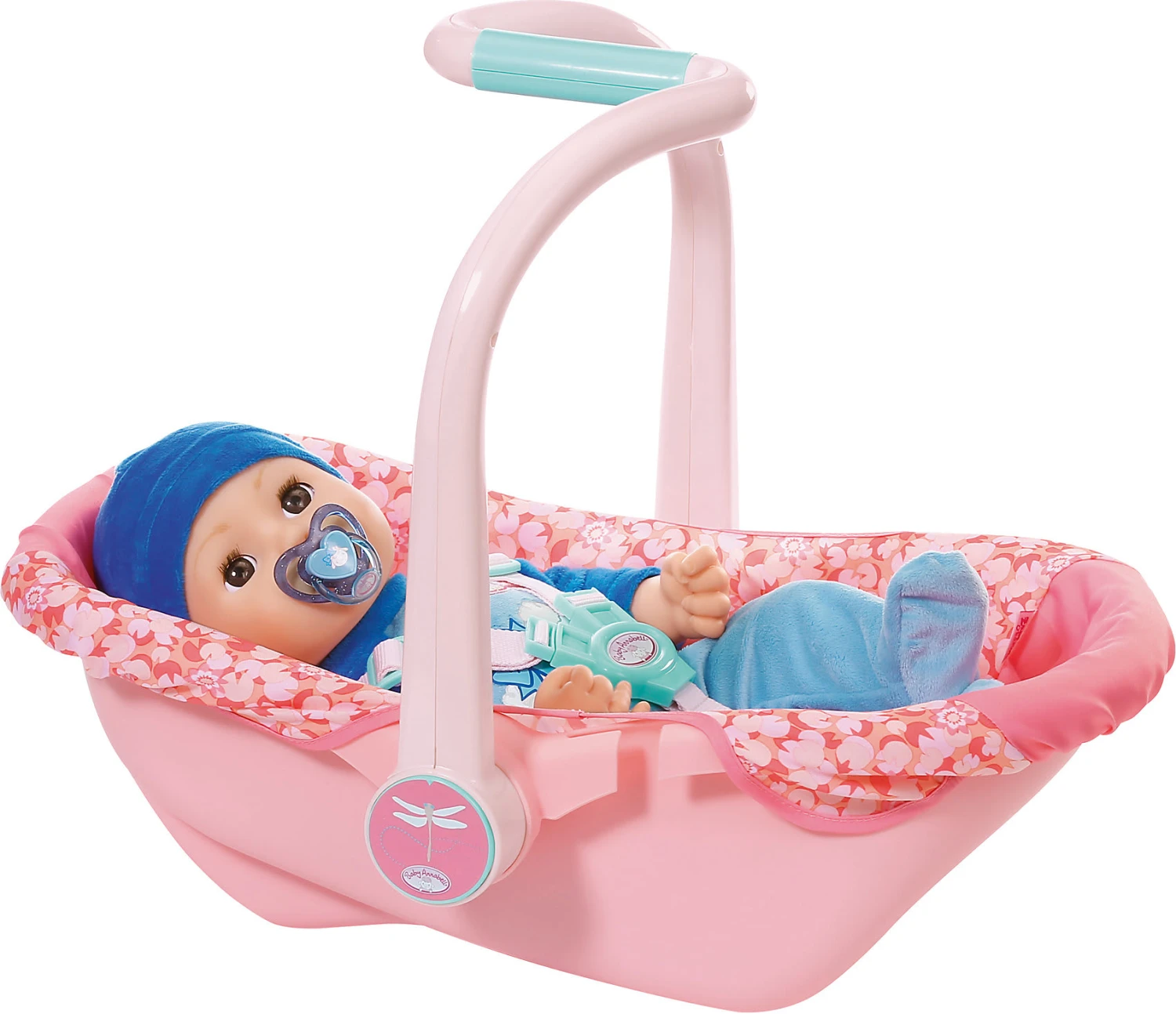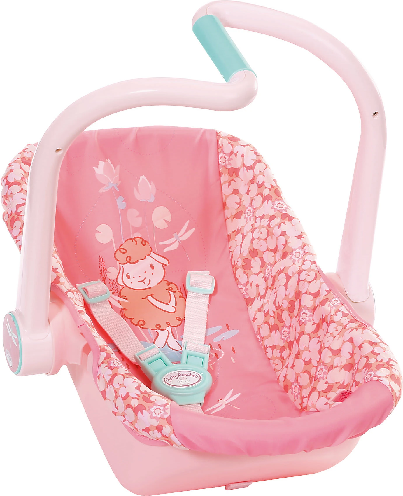 Wenn Mama und Papa mit Baby Annabell unterwegs sind, nehmen sie gerne den Komfortsitz. Baby Annabell Active Komfortsitz von Zapf zum Tragen, Sitzen, Schlummern und als Babyschale im Auto für Puppen bis 43cm ab 3 Jahren Dank des Z-Griffs kann die Babyschale besonders leicht getragen werden. Beim kleinen Stopp am Teich im Park kann der Henkel umgeklappt werden und der Komfortsitz ganz einfach zum Sitz umfunktioniert werden. Teichmotive wie Libellen und Wasserlilien sind überall auf dem Stoff zu finden. Wenn die Kleine unterwegs müde wird, kann sie ganz bequem darin schlummern. Geht’s mit dem Auto auf Tour, dann wird der Gurt einfach durch die seitlichen Einkerbungen gezogen und schon ist Baby Annabell sicher unterwegs. Hinweis: Kleidung/Accessoires für die Baby Annabell Markenspielpuppe