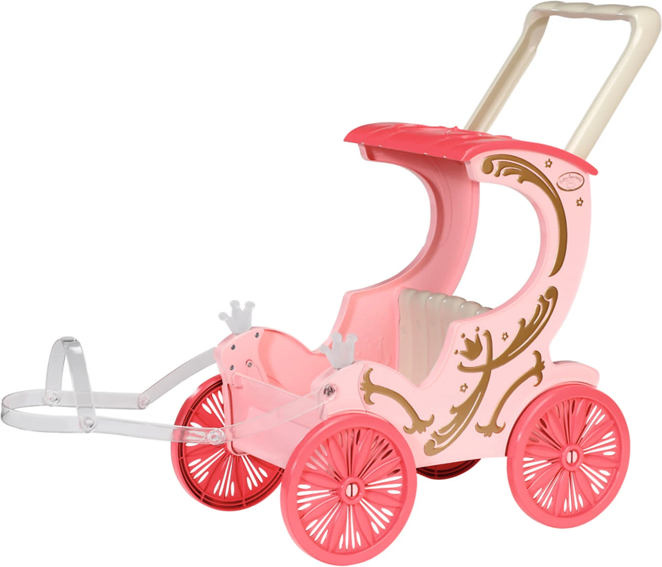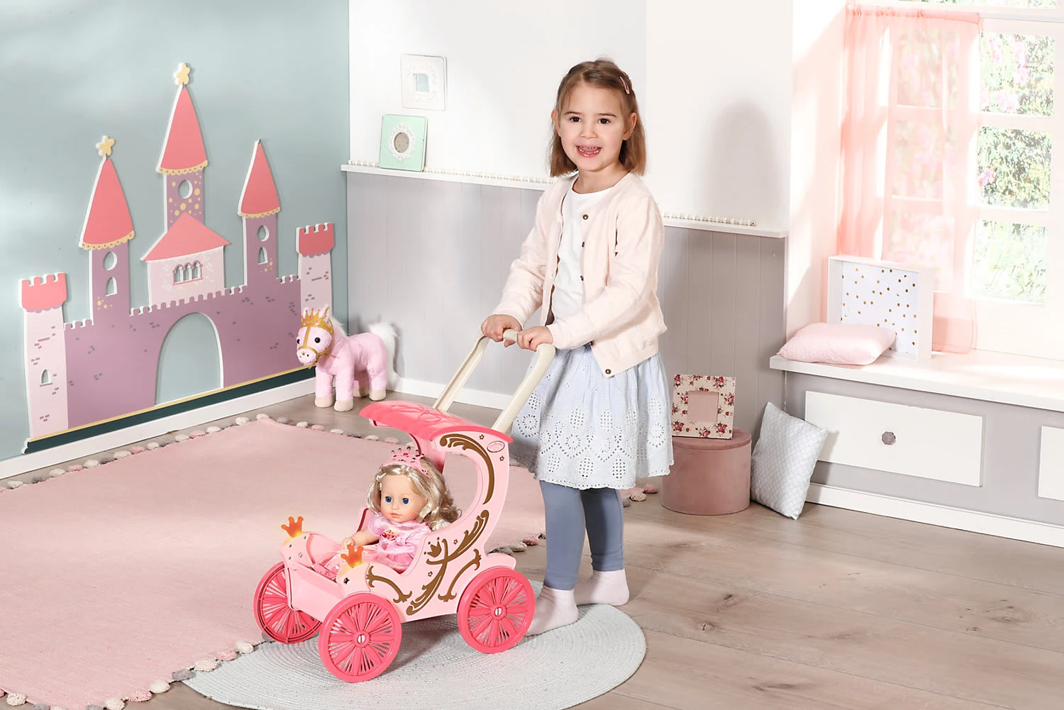 Jetzt wird es ganz herrschaftlich für die Baby Annabell Puppenkinder. Mit dieser bezaubernden Baby Annabell Little Sweet Kutsche können die kleinen Herrschaften herumgefahren werden: Der Schiebegriff ist in der Höhe perfekt für die Puppeneltern geeignet, kann aber auch heruntergenommen und unterhalb der Kutsche verstaut werden. Dann geht es mit 1 PS, mit dem niedlichen Pony zu einer Runde durch die Kinderzimmer-Welt. Das Pony kann mit dem Zaumzeug an der Kutsche befestigt werden und sobald sich die Kutsche in Bewegung setzt, leuchten die beiden Kronen im vorderen Bereich. Kreativer Spielespaß für alle Puppen zwischen 36 und 43 cm Höhe.