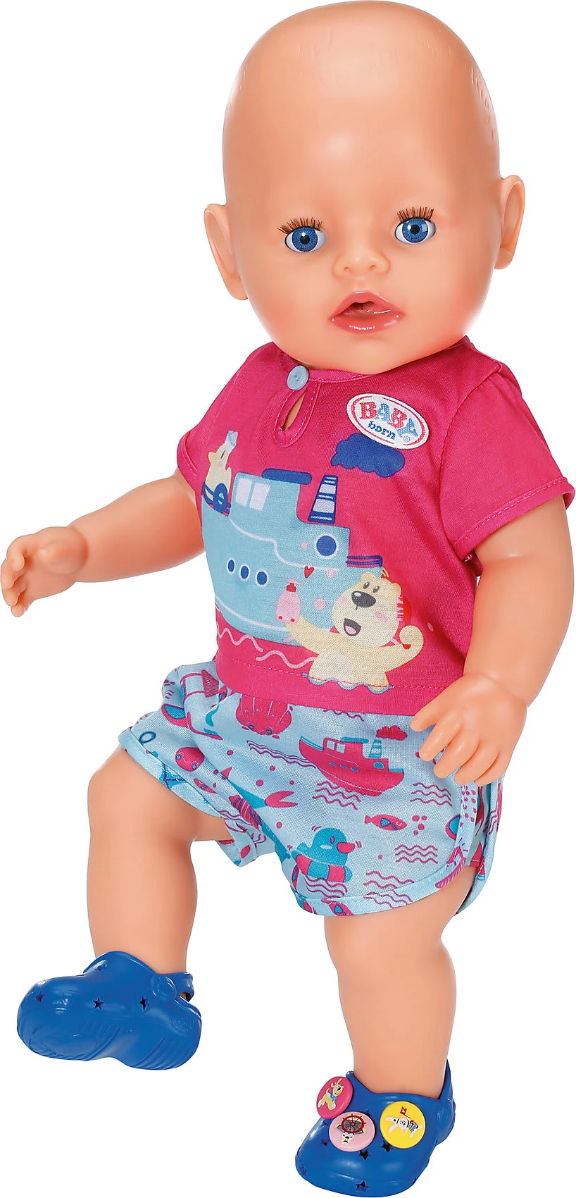 Ahoi Matrosen! Dieses umfangreiche Set für die BABY born begeistert mit einem tollen Outfit mit maritimen Thema. Shirt und Shorts sind aufeinander abgestimmt und mit liebevollen Schiffsmotiven. Jetzt nur noch in die praktischen Badeschuhe schlüpfen und schon ist BABY born bereit für einen Tag am Hafen.
