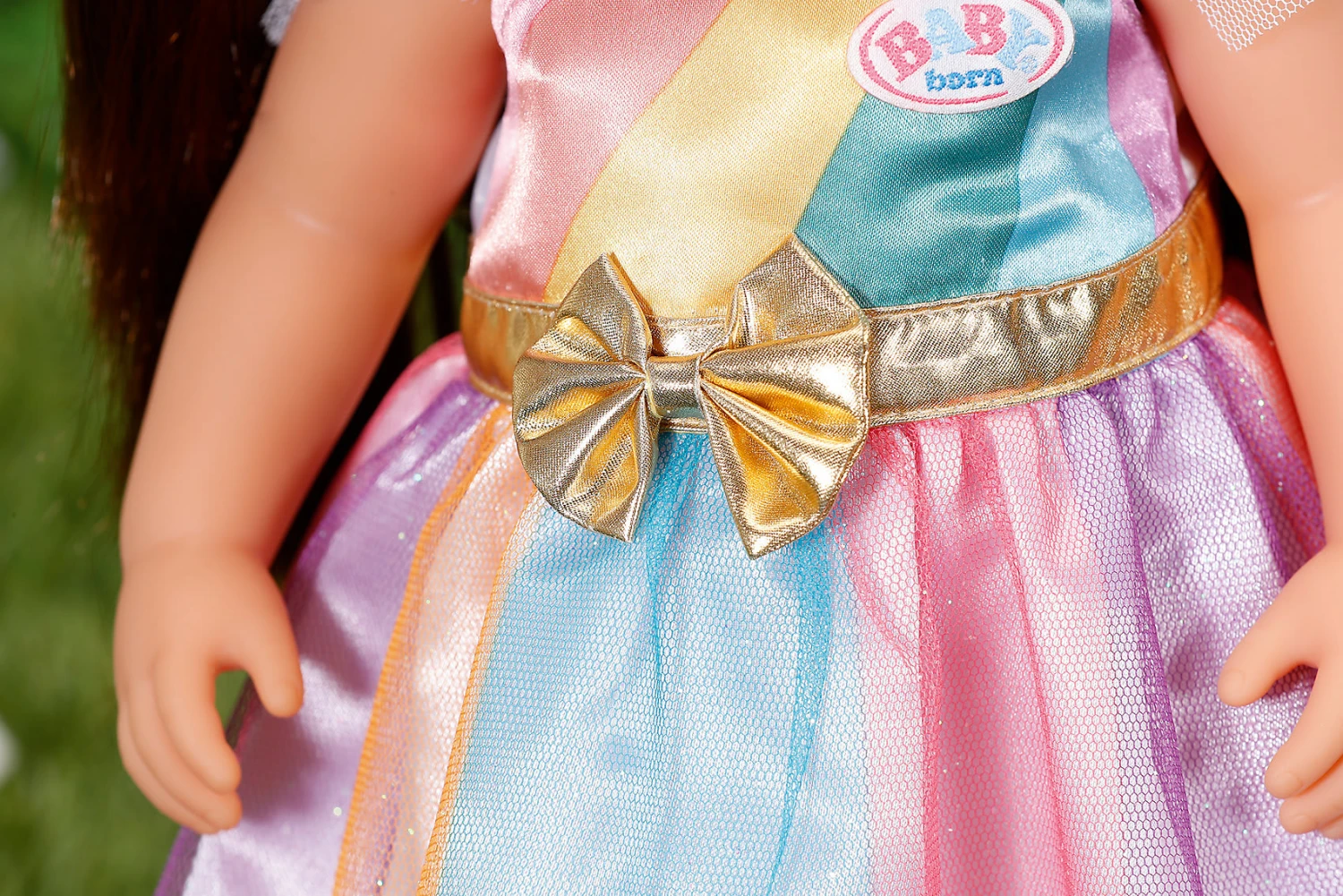 „Das ist meeeiiin Zauberstaaab!“- „Nein, das ist mein Zepter!“ BABY born und die Sister streiten sich gerade um das gekrönte Accessoire am Stiel. Puppen Outfit BABY born Fantasy Deluxe Prinzessin 43 cm von Zapf Creation bestehend aus Kleid und Schuhen inkl. Haarreif mit Pins und Zepter hochwertige Kleidung für die BABY born Markenspielpuppe (für Puppen bis 43 cm) kinderleichtes An- und Ausziehen für erweitertes, abwechslungsreiches und langanhaltendes Spielvergnügen aus Textil und Kunststoff ab 3 Jahren geeignet Bei BABY born geht noch alles um Feenstaub und wünsch-dir-was. Die Sister hat schon ihren eigenen Kopf und möchte, dass alle nach ihrer Pfeife tanzen. Tanzen mögen eigentlich beide sehr gerne. Im Prinzessinnenkleid mit Regenbogenfarben dreht es sich auch besonders gut. Der Überrock aus Tüll glitzert dabei ganz zauberhaft. Durch den asymmetrischen Schnitt sieht es so aus, als ob die Trägerin eine Schärpe trägt. Die goldenen Sandalen harmonieren bestens mit der Schleife um den Bauch. Ob Dickschädel oder nicht, ein Haarreif mit Einhorn, Krone, putzigen Öhrchen und entnehmbaren Pins muss einfach sein.