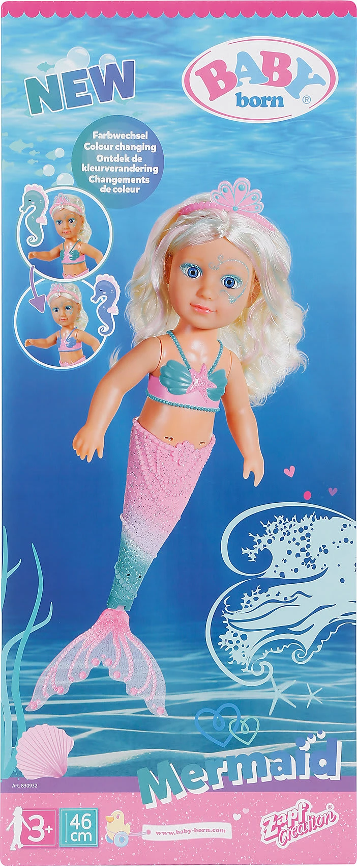 Meerjungfrauen sind geheimnisvolle Wesen. So auch die Little Sister Meerjungfrau. BABY born Little Sister Meerjungfrau 46cm von Zapf bewegt sich im Wasser Batterien 3x AAA nicht enthalten mit Farbewechsel-Effekt inklusive Kamm und Diadem ab 3 Jahren Sie bewegt ihren bunten , wenn sie durch Wasser gleitet. Sobald sie mit dem warmen feuchten Element in Berührung kommt, ändert sich die Farbe ihres Outfits von rosa-türkis auf türkis-blau. Wie macht sie das nur? Ihr langes blondes Haar hat farbenfrohe Strähnen. Ein putziges Diadem ziert die Haarpracht, die mit dem rosa Kamm wunderbar frisiert werden kann.