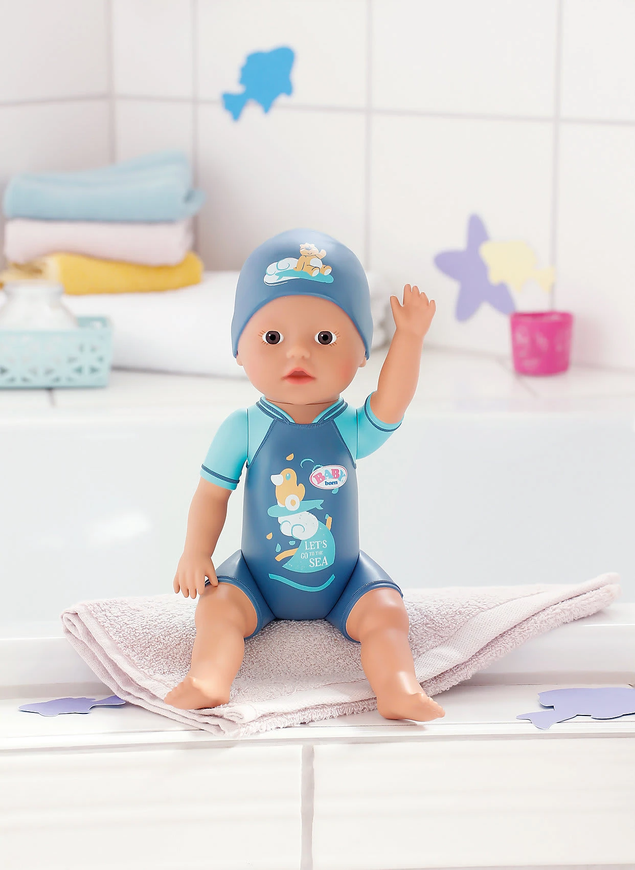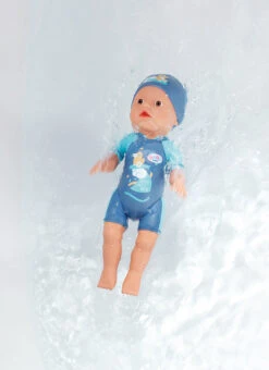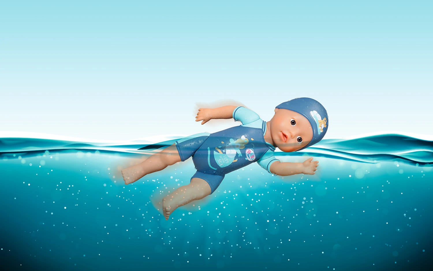 Wer schwimmt denn da? BABY born® hat schon schwimmen gelernt. Mit diesem bezaubernden BABY born® My First Swim Boy von Zapf Creation macht das Wasservergnügen gleich doppelt Spaß und kleine Puppeneltern können ihren Kleinen zugucken, wie sie sicher durch das Wasser kraulen. Und nicht nur das ? den Schmetterlingsstil beherrscht der kleine Kerl auch schon. Die tolle Schwimmpuppe wird durch das Drehen der Arme aufgezogen und schwimmt dann mithilfe des Aufziehmechanismus mühelos ein paar Bahnen in der Badewanne oder im Planschbecken. Beim Kraulen tauchen die Arme nacheinander ins Wasser und beim Schmetterlingsstil werden beide Arme eingetaucht. Ob sich die Puppeneltern hier sogar was abschauen können? Die beweglichen Beine und der Kopf sorgen für noch mehr Spielespaß und das niedliche Schwimm-Outfit ist ein leicht erhabener Print. Für tolle Spielemomente im Wasser und auch außerhalb!