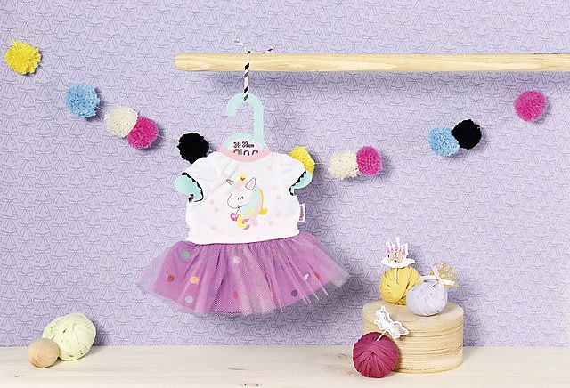 Mit Zapf Creation Dolly Moda kann man immer punkten! Dank des lässigen Schnitts können BABY born, Baby Annabell und andere Puppen in einer Größe von 34-38 cm fröhlich die Kleidung hin und her tauschen. Vom weißen Shirt mit verspielten Ärmelabschlüssen schaut ein verträumtes Einhorn herunter. Vielleicht tanzt es im Schlaf durch bunte Punkte, die vom magischen Himmel fallen? Denn sowohl das Shirt als auch das niedliche Tutu sind mit farbenfrohen Punkten versehen.