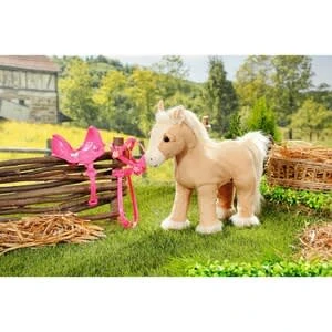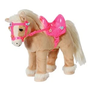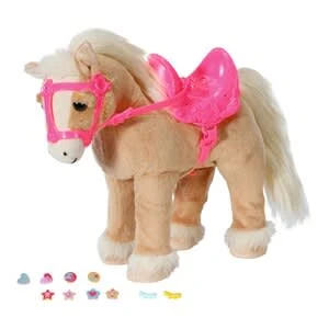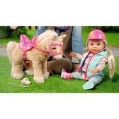 Wenn BABY born in der Boxengasse steht und die Pins aus der Pferdekiste holt, ist bestimmt ein Reitturnier angesagt. Dann macht sie ihr süßes Pony immer besonders hübsch zurecht. BABY born My Cute Horse mit Sattel, Zaumzeug und Pins von Zapf Creation hochwertiges Zubehör für die BABY born Markenspielpuppe für erweitertes, abwechslungsreiches und langanhaltendes Spielvergnügen mit Sound- und Motion-Effekten aus Textil und Kunststoff ab 3 Jahren geeignet Der rosa Sattel und das rosa Zaumzeug werden mit bunten Ansteckern verziert und die weiße Mähne und der weiße Schweif ausgiebig frisiert. Das putzige Pferdchen weiß auch schon genau, was los ist und wiehert aufgeregt. Das tut es, wenn sein rechtes Ohr gedrückt wird. Durch Druck auf das linke Ohr setzt sich das Pferd in Bewegung. Es läuft am liebsten auf ebenen Oberflächen. Dabei sind Hufgetrappel und freudige Pferdegeräusche zu hören. Erneuter Druck aufs linke Ohr stoppt den Reitausflug. Hinweis Batterien (4 x AA Mignon) sind nicht im Lieferumfang enthalten. Bitte separat bestellen.