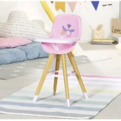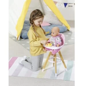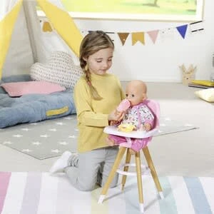 Im praktischen Hochstuhl kannst du BABY born ganz einfach füttern. Der Stuhl im skandinavischen Design hat Beine in Holz-Optik und einen bequemen pinken Sitz. BABY born Hochstuhl von Zapf hochwertiges Zubehör für die BABY born Markenspielpuppe auch für kleinere Puppen geeignet (36cm bis 43cm) ab 3 Jahren Bär Bruno und Ente Berta warten auf der Rückenlehne auch schon gespannt aufs Essen. Auf dem hellrosa Tischchen haben BABY borns Breiteller und ihre Flasche Platz. Und natürlich ist das Tischchen nicht nur zum Essen da. Hier darf auch gemalt, gebastelt und mit Bauklötzen gespielt werden.