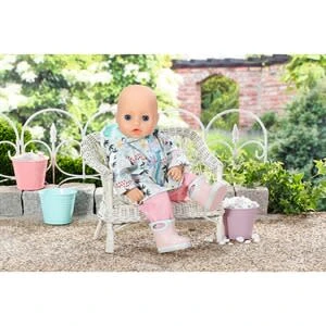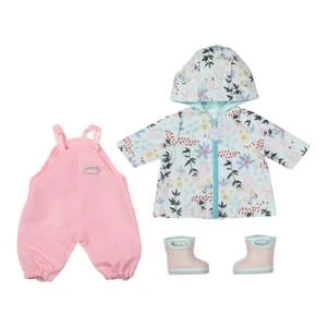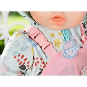 „Regentropfen, die auf das Dächlein klopfen…“ Nun ja, das Dächlein ist hier die Kapuze von Baby Annabells mintfarbenem Regenmantel. Denn sie braucht mit diesem coolen Outfit kein Dächlein über dem Kopf, wenn es regnet. Baby Annabell Deluxe Regen Set von Zapf Creation Latzhose, Regenmantel und Stiefel original Kleidung für die Baby Annabell Markenspielpuppe in 43 cm aus Textil und Kunststoff ab 3 Jahren geeignet Der Mantel ist mit Blumen, Blättern und Blüten des Regenwaldes bedruckt. Dazu trägt die kleine Wassermaus eine rosa Matschhose. Denn auch bei Regen kann im Sandkasten gespielt werden. Diese Pampe aus Sand und Wasser ist einfach grandios! Mit den putzigen Gummistiefeln kann sie an Mamas Händen von Pfütze zu Pfütze hüpfen oder bei schönem Wetter durch die Bächlein auf dem Wasserspielplatz laufen. Das hochwertige Zubehör fördert die Fantasie und bringt neue Spielanregungen und –möglichkeiten.