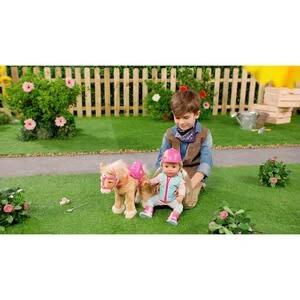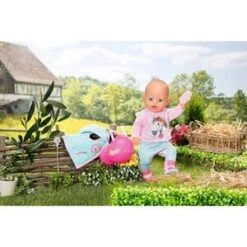 Wenn es auf ein Reitturnier geht, dann putzt BABY born nicht nur ihr süßes Pferdchen heraus, sondern auch sich selbst. Mit dem türkis-pinken Outfit sieht sie auf ihrem hellbraunen Pony richtig chic aus. BABY born Deluxe Reitoutfit 43 cm von Zapf Creation bestehend aus Weste, Shirt, Hose und Stiefeln inkl. Helm, Gerte und Striegel hochwertige Kleidung für die BABY born Markenspielpuppe (für Puppen bis 43 cm) kinderleichtes An- und Ausziehen für erweitertes, abwechslungsreiches und langanhaltendes Spielvergnügen aus Textil und Kunststoff ab 3 Jahren geeignet Die Reithose hat einen verstärken Hosenboden. Auf dem Longsleeve ist ein herziges Pferdegesicht abgebildet. Durch die Rüschen an den Ärmeln kommt das Shirt auch unter der Weste super zur Geltung. Die kuschelige Weste hat eine Kapuze, damit der Wind im Galopp nicht ganz so sehr um die Ohren weht. Der pinke Helm und die pinken Stiefel sind mit speziellen Elementen bedruckt. Zum Outfit gehören außerdem eine Striegelbürste und eine Gerte.