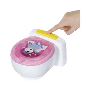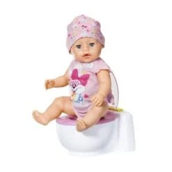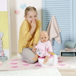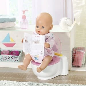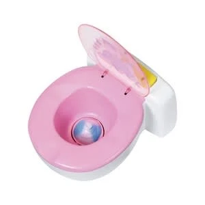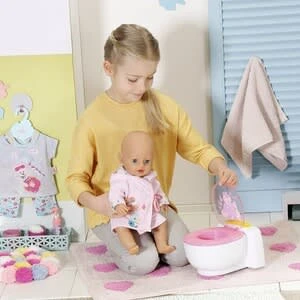 BABY born ist schon ein großes Mädchen. Sie geht ganz selbstbewusst auf die Toilette. BABY born Bath Toilette von Zapf mit Sound-Effekten und magischem Kack-Häufchen Batterien erforderlich 2x AA (nicht enthalten) hochwertiges Zubehör für die BABY born Markenspielpuppe auch für kleinere Puppen geeignet (36cm bis 43cm) ab 3 Jahren Kaum sitzt sie auf ihrem weißen Thron mit pinker Brille, sind Pipi-Geräusche, Applaus und BABY borns zufriedenes Lachen zu hören. Die Kleine macht sogar ein großes Geschäft. In der Schüssel erscheint ein bunt glitzerndes Kack-Häufchen. Jetzt aber schnell spülen. Mit Druck auf dem Spülknopf verschwindet das Häufchen begleitet von Spülgeräuschen.