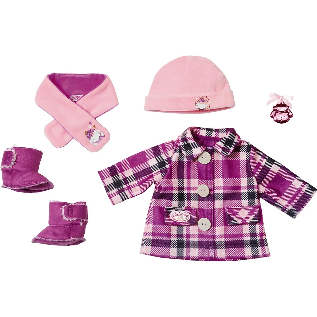 Zum Herbstspaziergang im Stadtpark bekommt Baby Annabell ihren karierten Mantel angezogen. Die kuschelige Jacke mit Karos in allen Größen und Knopf-Applikationen hält die Kleine schön warm und ist super schick. Passend dazu gibt es pinke Fellstiefelchen für warme Füßchen. Für einen geschützten Kopf sorgt die rosa-farbige Mütze. Damit die Spaziergängerin keinen Schnupfen bekommt, gibt es im Mantelset auch einen Schal mit Schäfchen-Druck.