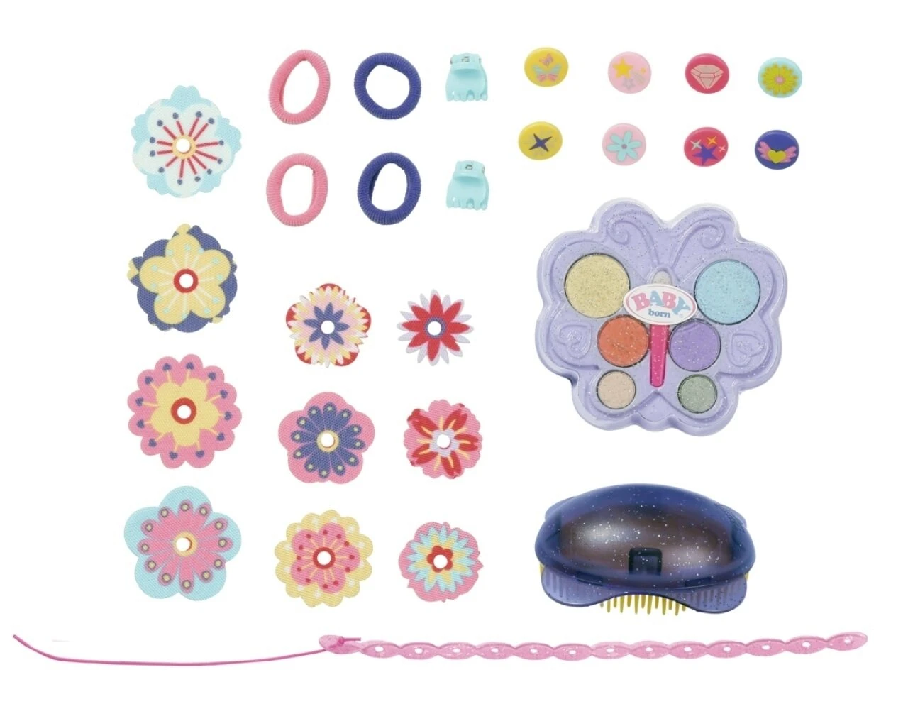 Egal, ob wild verstrubbelte Mähne, ordentlich nach hinten gebundener Schopf oder aufwendig geflochtener Zopf, das qualitativ hochwertige Haar ist für alle Frisuren geeignet. 4 Haargummis, 2 Klammern und die Bürste helfen beim Hairstyling. Das pinke Haarband kann in die Frisur integriert und mit Blüten und Pins verziert werden. Die Blumendekoration passt auch prima zum und ans lila Top.