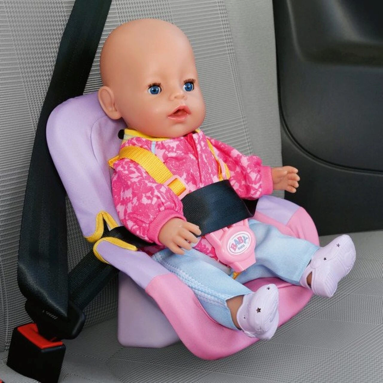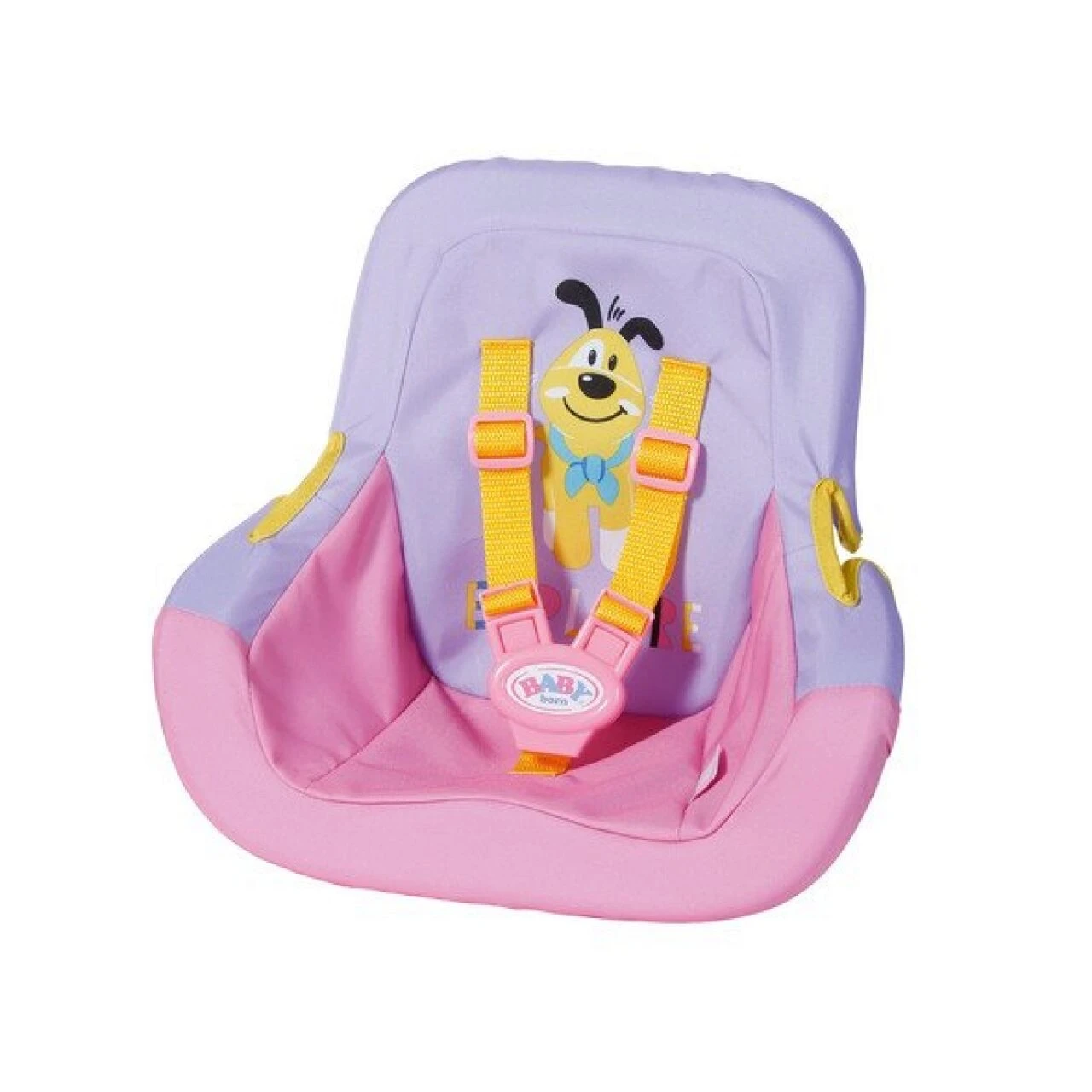 Wenn BABY born mit Mama und Papa auf Entdeckungsreise geht, dann sind sie auch öfters mit dem Auto unterwegs. BABY born hat dafür einen Autositz in lila und rosa. Hund Bello auf der Rückenlehne ist auch gerne mit von der Partie und entdeckt gerne neue Sachen. Das farblich abgesetzte Gurtsystem hält BABY born sicher und bequem im Sitz. Nach dem Anschnallen mit dem gelben Sicherheitssystem wird der Gurt des Autos durch die seitlichen Einkerbungen gezogen und schon ist BABY born sicher mit auf Tour.