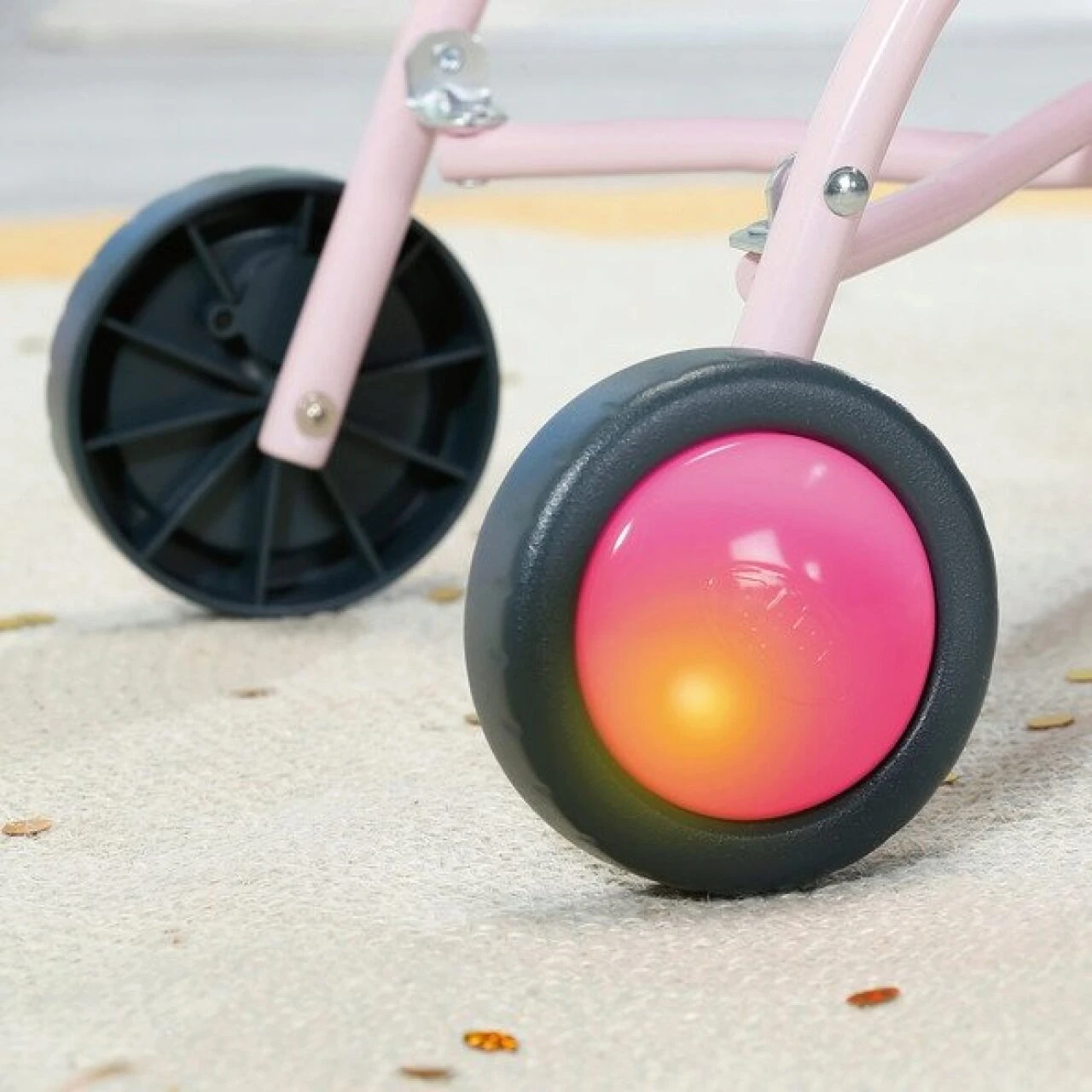 Die Außenseite der Räder leuchtet in bunten Farben, wenn der Buggy in Bewegung gesetzt wird. Wenn BABY born während der Fahrt nach den Sternen greift, hält sie das Gurtsystem sicher im Sitz. Für längere Touren auf der Milchstraße gibt es eine Trinkflasche inklusive Clip-Halterung für BABY born und die Geschwister.