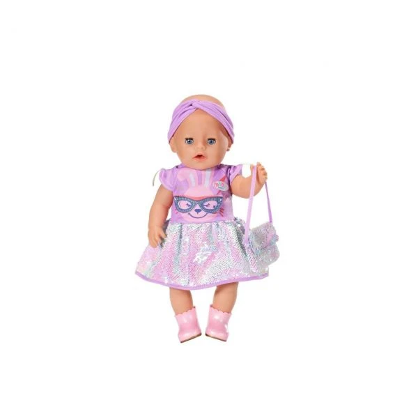 Die blaue Maske kann sowohl als Brille am Kopfband getragen werden, als auch Hase Benno auf dem Kleid als Styling-Element dienen. Das Häschen ist schließlich gerne mit von der Party. Das Kleidchen hat einen Rock aus Wende-Pailletten. BABY borns Handtasche ist ebenfalls mit den glitzernden Scheibchen verziert. Um den Kopf trägt sie ein Stirnband im besonders trendigen Design. Rosa Booties runden das Geburtstagsoutfit ab.