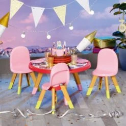 Zum Torten-Schmaus nehmen BABY born und ihre beiden Lieblingsgäste am Geburtstagstisch Platz. Die drei Stühle und der Tisch in Holz-Optik sind im top aktuellen skandinavischen Design gestaltet. Die Tischplatte ist mit süßen Geburtstagsmotiven verziert und hat in der Mitte einen Drehteller für die Torte. Das Mobiliar kann zusätzlich mit Stickern dekoriert werden.