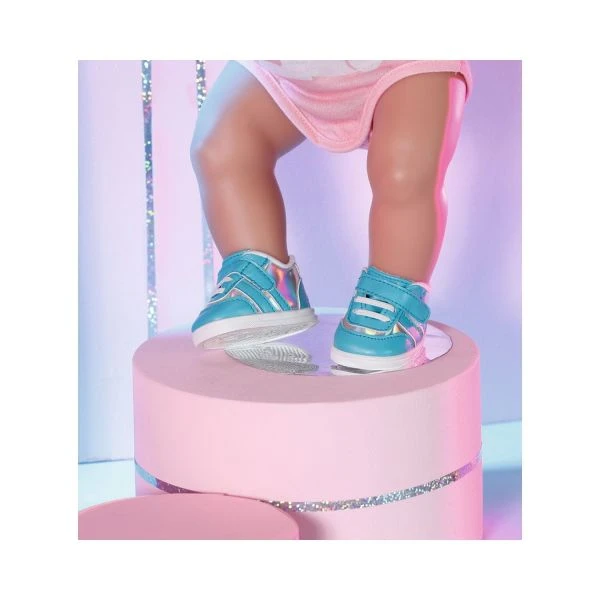 Eigentlich ist es ja unhöflich, sein Gegenüber nicht anzuschauen, wenn man sich unterhält. Aber dieser holographische Effekt in BABY borns Schuhen lenkt viel zu sehr ab. Da muss man ständig bewundernd nach unten gucken. Zwischen dem türkisen Leder reflektiert die Silberfolie das Licht in den Farben des Regenbogens.