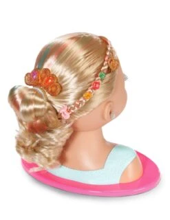 Willkommen im Schmink-Salon für kleine Style-Prinzessinnen! Hier können junge Visagisten mit der bunten Schminkpalette wunderschöne Make-Up-Kreationen zaubern – und das alles mit hautverträglichen Farben. Der Schminkkopf mit seinen hochwertigen, blonden Haaren inklusive zart bunter Strähnen, lässt sich ganz einfach mit Haargummis, Haarklips, Klammern und einer Bürste stylen. Ob romantische Locken, elegante Hochsteckfrisur oder wilde Zöpfe – in den königlichen Gemächern ist alles erlaubt. Das Highlight sind die bunten Edelstein-Pins zum Verzieren, die mit der transparenten Glitzer Tiara um die Wette funkeln. Jetzt noch die passenden Ohrringe, um das Styling zu vollenden und unsere Prinzessin ist bereit für den großen Auftritt.