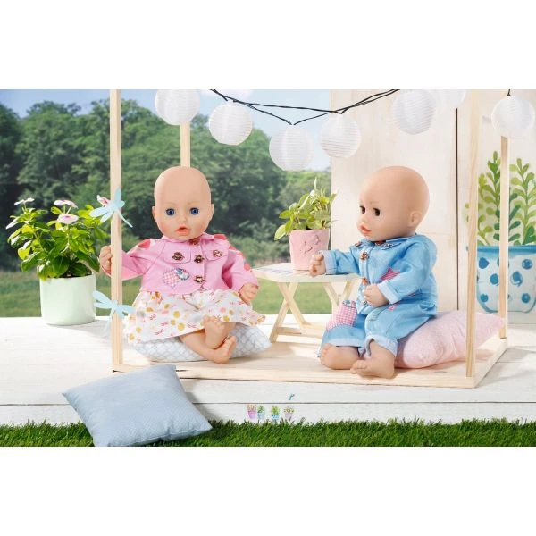 Niedliches Outfit – bestehend aus 2 Teilen – jeweils für Mädchen oder Junge. Das Mädchen bekommt einen sommerlichen Rock mit passendem Jäckchen, der Junge eine lässige Jeans mit passender Jacke dazu – jeweils auf Kleiderbügel.