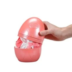 Im rosa Ei versteckt sich ein hasenstarkes Outfit für Baby Annabell. Das putzige Kleid ist oben mit rosa Rüschen und einer Schleifenapplikation verziert. Der weiße Stoff ist über und über mit Punkten bedruckt. Die schauen fast aus, wie kleine Ostereier. Den unteren Rand ziert die ganze Hasenbande bei der Eierverteilung. Für die Osterdeko ist im Set noch einen Stickerbogen enthalten.