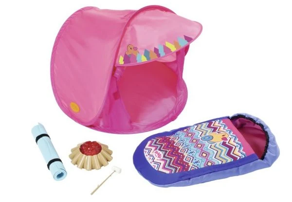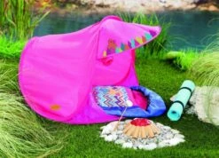 Sommerzeit, Camping Zeit… Aber so ein Camping Ausflug will gut vorbereitet sein, denn wenn man im Garten übernachten möchte, dann braucht man so einiges. Als allererstes wird das pink Zelt eingepackt, dann die Iso-Matte, damit man auch bequem liegt und zu guter Letzt der Schlafsack mit tollem Indianer-Muster. Zelt fertig aufgebaut? Dann kann es sich BABY born® mit ihrer Sister am leuchtenden Lagerfeuer gemütlich machen und Marshmallows am Stock grillen.