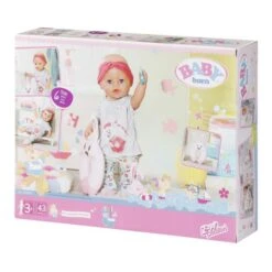 Zähneputzen ist wichtig. Das weiß BABY born ganz genau. Nicht nur, wenn man solch leckere Donuts gegessen hat, wie sie auf dem Outfit abgedruckt sind. Mit Shirt im Lagenlook, bunter Hose mit raffiniertem Wickelbund und stylischem pinken Stirnband steht sie im Bad und säubert aufmerksam die noch nicht vorhandenen Beißerchen. Danach rutscht sie mit ihren flauschigen Socken über den Fliesenboden, um es sich im Sessel bequem zu machen. Wenn sie ihrer Gute-Nacht-Geschichte lauscht, legt sie immer das Schulter-Häschen um. Falls sie während dem Vorlesen einschläft fällt ihr Köpfchen entspannt auf das Polster, statt unsanft auf die Lehne.