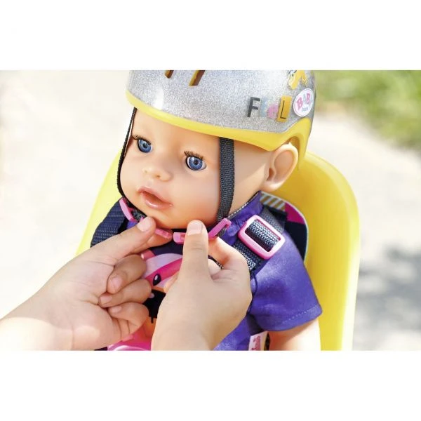 Hui, da ist gerade ein kleiner Silberpfeil vorbei geflitzt. Das war BABY born mit ihrem stylischen Fahrradhelm. Die silberne Kopfbedeckung für mehr Sicherheit auf Tour schimmert im Sonnenlicht. Schön den Kinnriemen schließen, damit der Helm auch gut hält und schon kann’s los gehen. Der Brother und die Sister stetzen das trendige Teil auch immer zum Skaten auf.
