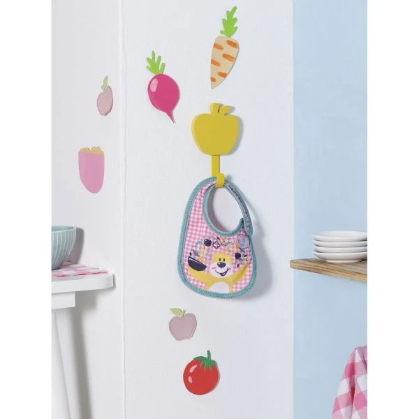 Da haben wir den Salat. Zwei Lätzchen zur Auswahl und BABY born kann sich einfach nicht entscheiden, welches sie zum Mittagessen tragen will. Auf dem grün-gestreiften Exemplar hüpft Hase Benno fröhlich zwischen Karotten und roter Bete durch die Beete. Das pink-karierte Teilchen zeigt Chefkoch Bär Bruno, wie er Gemüsesuppe zubereitet. Hoffentlich dauert die Auswahl des Menüs nicht genauso lang…