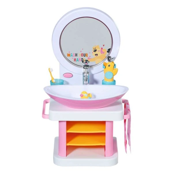So, erst mal das Licht anmachen, damit sich der kleine Dreckspatz genau anschauen kann. Der Rand des Spiegels leuchtet und eine Melodie spielt, wenn der rosa Knopf unterhalb des Spiegels gedrückt wird. Wie lange muss man jetzt nochmal die Hände waschen? Ganz einfach! Drück auf den Seifenspender und wasche die Hände so lange, wie das Lied erklingt. Toll gemacht! Der Ente-Berta-Stöpsel verschließt das Waschbecken, während man mit dem Wasserhahn echtes Wasser ins Becken pumpen kann. Wird der Stöpsel gezogen verschwindet es im Abflussrohr. Hände abtrocknen und noch die Zähne mit der gelben Zahnbürste putzen. Wird der blaue Zahnputzbecher aus seiner Halterung entfernt, sind lustige Gurgelgeräusche zu hören. Mit diesem weiß-rosa Waschbecken macht Körperhygiene richtig Spaß!
