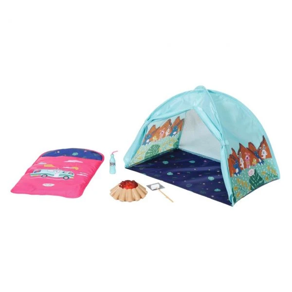BABY born Weekend Camping Set aus Zelt, Schlafsack, Lagerfeuer, Marshmallow-Stick und Limoflasche