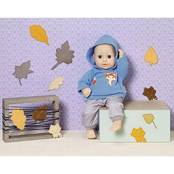 Ein putziges Eichhörnchen „transportiert“ seine Nuss durch die Kängurutasche des weichen blau-farbenen Kapuzenpullis. Damit sich die Puppe bei allen Spielaktivitäten frei bewegen kann, gibt es dazu noch die passende Jogginghose in grau.