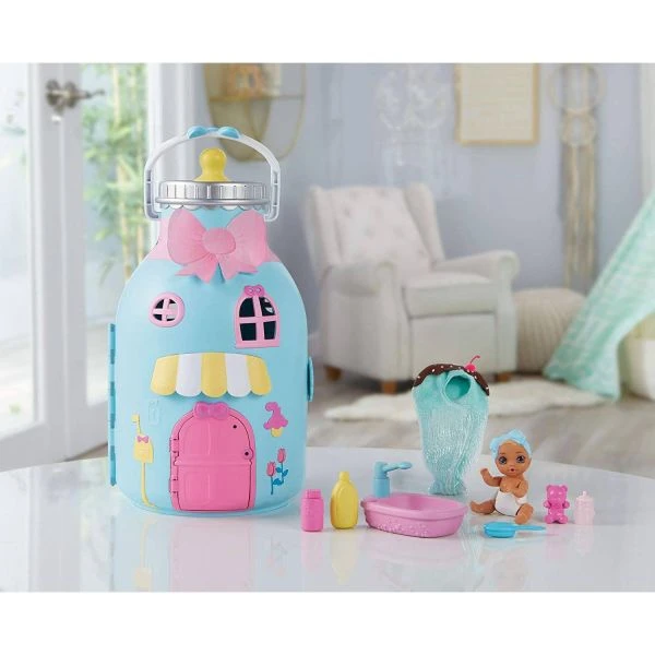 Ein verspieltes Nest vom Storch. Meister Adebar hat eine blaue Babyflasche geliefert, die sich als putziges Haus entpuppt. Und einen ganz speziellen Bewohner hat es auch noch. Wird der Trinkbehälter mit Tragegriff aufgeklappt, öffnet sich eine bezaubernde Wohnlandschaft auf zwei Etagen. Im Erdgeschoss befindet sich das Spielzimmer mit Spielbogen und Teddybär. Gegenüber ist der Wickeltisch inklusive Puderdose und Bürste platziert. Bevor es im Obergeschoss ins Bettchen mit Mobile geht, wird nochmal ausgiebig gebadet. In der Badewanne mit Wasserfunktion inklusive Badeschaumflasche fühlt sich das Baby aus der Flasche so richtig wohl. Das Überraschungs-Babys trinkt gerne Wasser aus dem Fläschchen und macht in die Windel, die sich dann zu einem tollen Muster verfärbt. Die Haare verfärben sich ebenfalls, wenn sie in Berührung mit Wasser kommen. Wenn alle seine Eigenschaften entdeckt wurden, kann das Geburtszertifikat aufgefüllt werden. Inklusive Übersicht über alle BABY born Surprise Babys und Spielspaß.